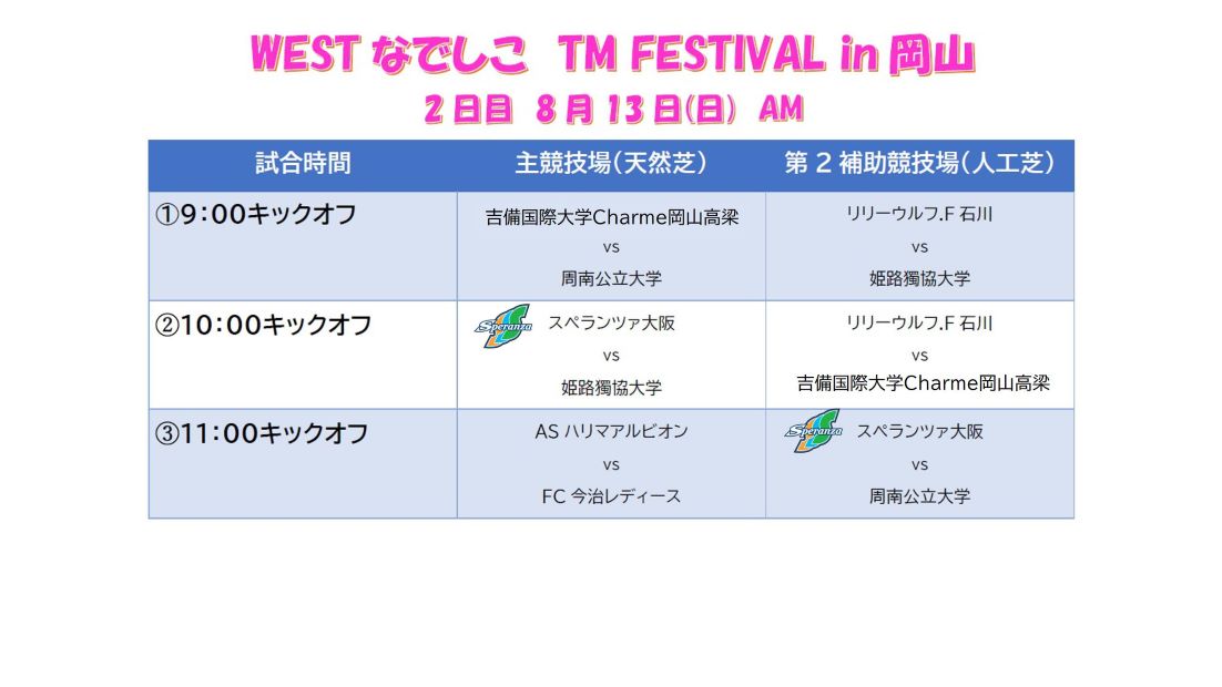 試合スケジュールのお知らせ_『WESTなでしこTM FESTIVAL in 岡山』