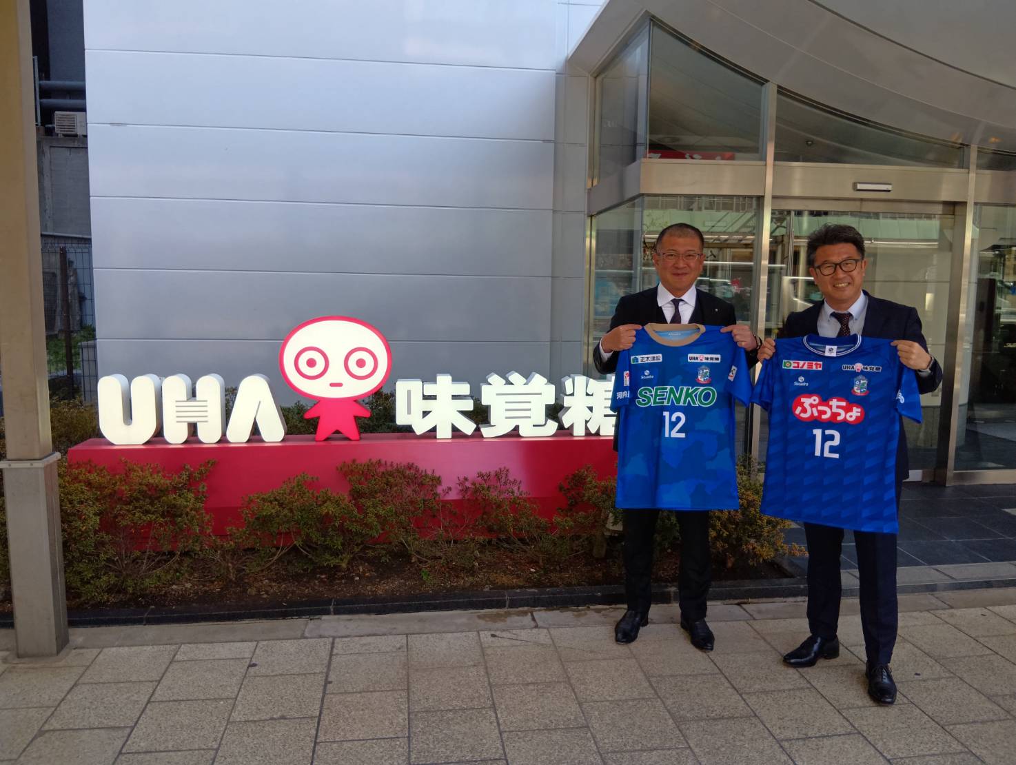 最後にはUHA味覚糖本社前にて、山田社長と弊クラブ社長坪佐で贈呈させて頂いたユニフォームを手に記念撮影を行いました。