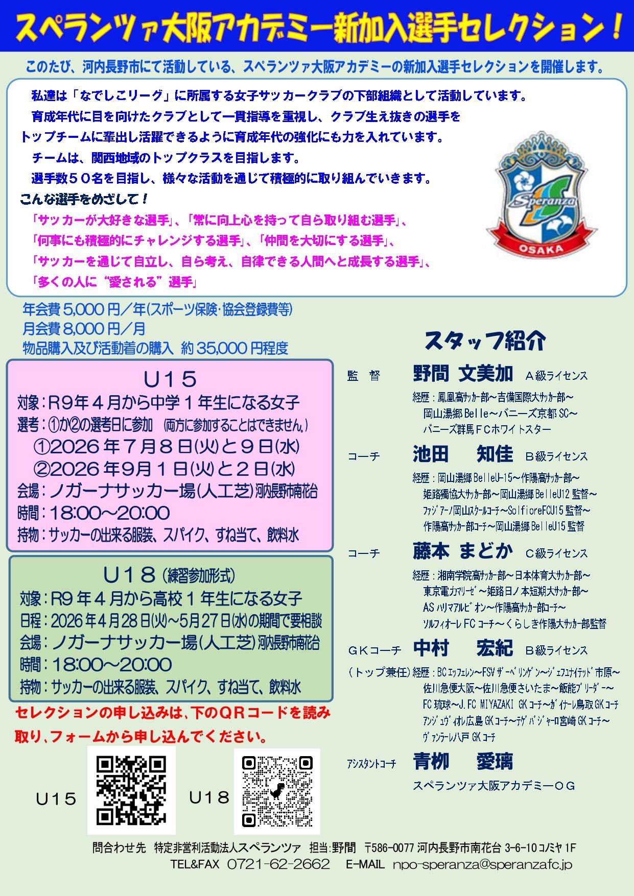 2026年度 スペランツァ大阪U15/U18新加入セレクションについて